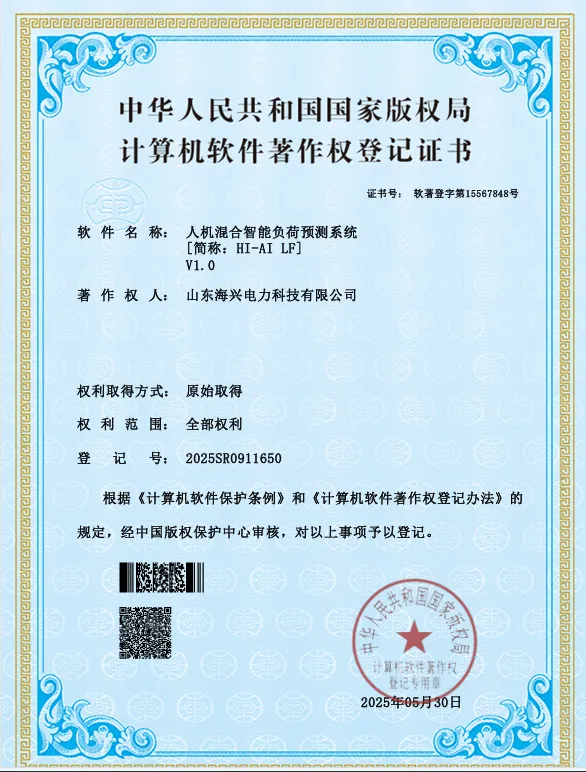 在新型電力系統加速建設的今天,地區(市)級負荷預測仍深陷“人工經驗主導”的困局——響應慢、誤差高、難適配新能源波動,成為電網安全運行的隱憂。山東海興電力以技術革新破局,自主研發的人機混合智能負荷預測系統(HI-AI LF)正式獲得國家軟件著作權,為地區(市)電網調度注入“人工智能+專家經驗”雙核動力!